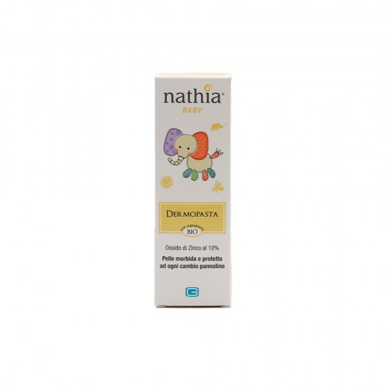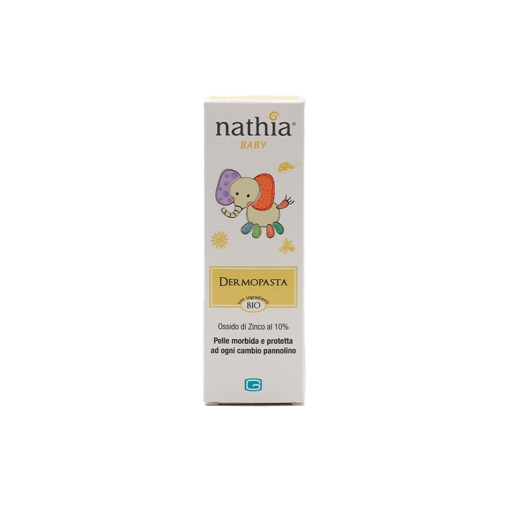 Nathia Dermopasta è una crema con ossido di zinco formulata per proteggere da arrossamenti e irritazioni la pelle del bambino a contatto con il pannolino. I preziosi estratti vegetali come l'olio di mandorle e il burro di karitè aiutano a lenire e ammorbidire la pelle; l'amido di riso, la calendula e il fieno greco contribuiscono a mantenere una corretta idratazione ed evitare gli arrossamenti. L'ossido di zinco presente al 10% funge da barriera contro le irritazioni formando uno strato protettivo sulla cute del bambino.