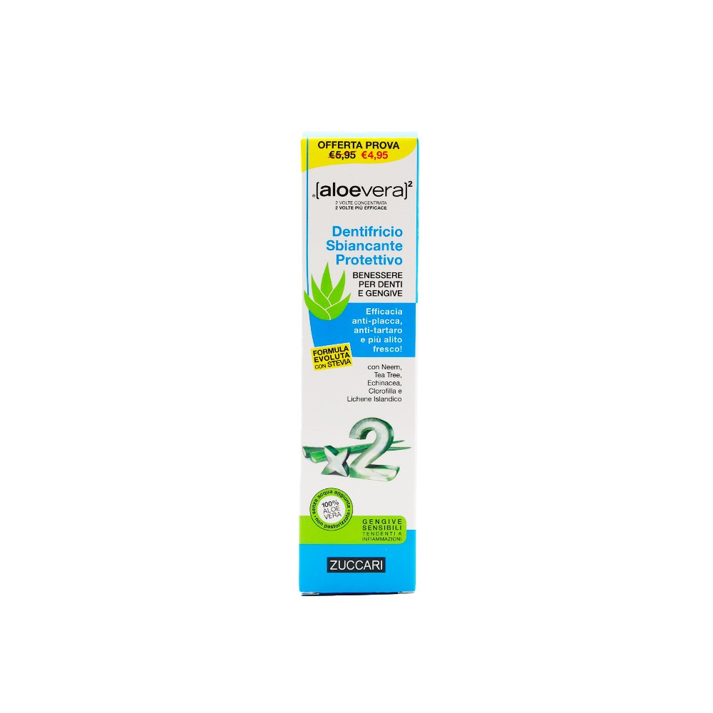 Aloevera2 Dentifricio apporta benessere e bellezza per denti e gengive, con una efficacia anti-placca, anti-tartaro e in più alito fresco. Per una pulizia profonda nel rispetto dello smalto dei denti ed effetto lenitivo sulle gengive più delicate. Una formulazione innovativa senza acqua aggiunta, completamente sostituita con succo d'Aloe vera non pastorizzata e non filtrata a carbone, concentrato due volte attraverso l'esclusivo processo ReversOsmose, processo meccanico grazie al quale è possibile concentrare la materia prima senza alterarne la bio-attività; l'acqua presente è solo quella naturalmente contenuta negli attivi e non è stata aggiunta in quanto tale. Le proprietà antinfiammatorie, lenitive, calmanti, riepitelizzanti, rigeneranti delle cellule, cicatrizzanti, rinfrescanti del gel di Aloe vera la rendono particolarmente utile anche per denti e gengive particolarmente sensibili, tendenti al sanguinamento. Completano la formulazione l'olio di Neem e il Lichene islandico, per un effetto sbiancante, Clorofilla e Rosmarino per l'alito fresco, Tea Tree oil ed Echinacea contro placca e tartaro, vitamine A, C e P. Senza Menta, per non interferire con le cure omeopatiche. Edulcorato con estratto di Stevia.