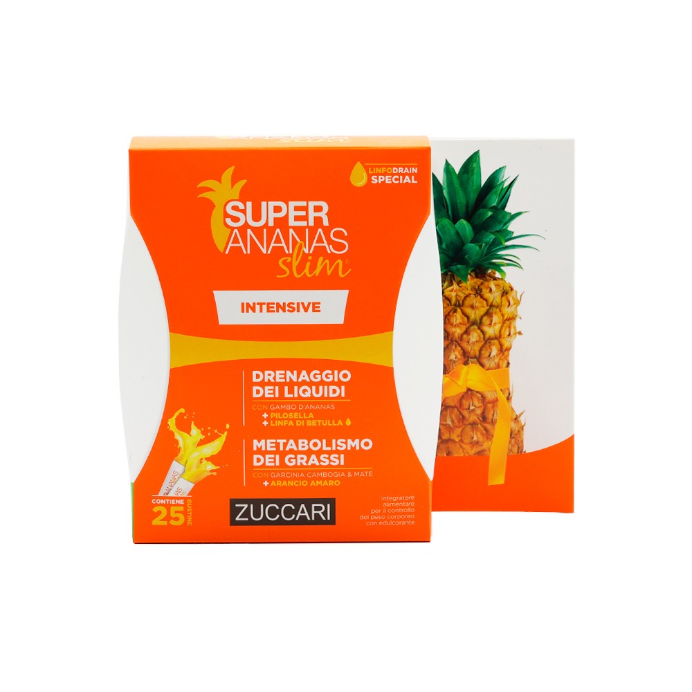 Super Ananas Slim Intensive è un integratore formulato con estratti vegetali di Ananas, Garcinia, Arancio amaro, Matè, Pilosella e Betulla, utili per aiutare a ritrovare la linea, favorire il drenaggio dei liquidi in eccesso, promuovere il metabolismo dei grassi e l'equilibrio del peso corporeo, contrastare il gonfiore e la sensazione di pesantezza, con la dolcezza di un succo d'Ananas a fine pasto.