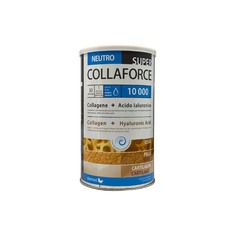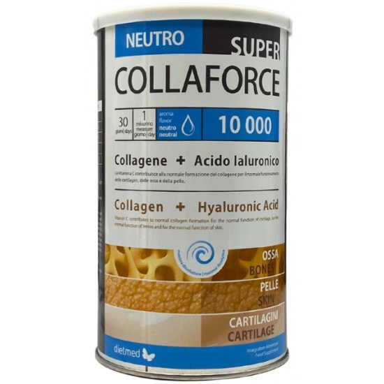 Dietmed Collaforce Super 10000 è un integratore alimentare a base di piante, vitamine e minerali. La vitamina C contribuisce alla normale formazione del collagene per il normale funzionamento delle cartilagini, delle ossa e della pelle. La vitamina D e il magnesio contribuiscono al mantenimento di ossa normali e al normale funzionamento muscolare.