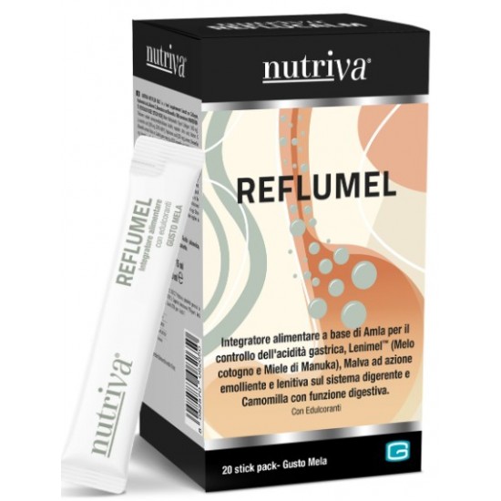 Nutriva Reflumel è un integratore alimentare a base di Lenimel° (Melo cotogno e Miele di Manuka), Amla, Malva, Camomilla e Acacia. L’Amla aiuta a controllare l’acidità gastrica e coadiuva la funzione epatica. Melo cotogno, Malva e Acacia esercitano un’azione emolliente e lenitiva sul sistema digerente. La Camomilla contribuisce alla funzione digestiva e al rilassamento.