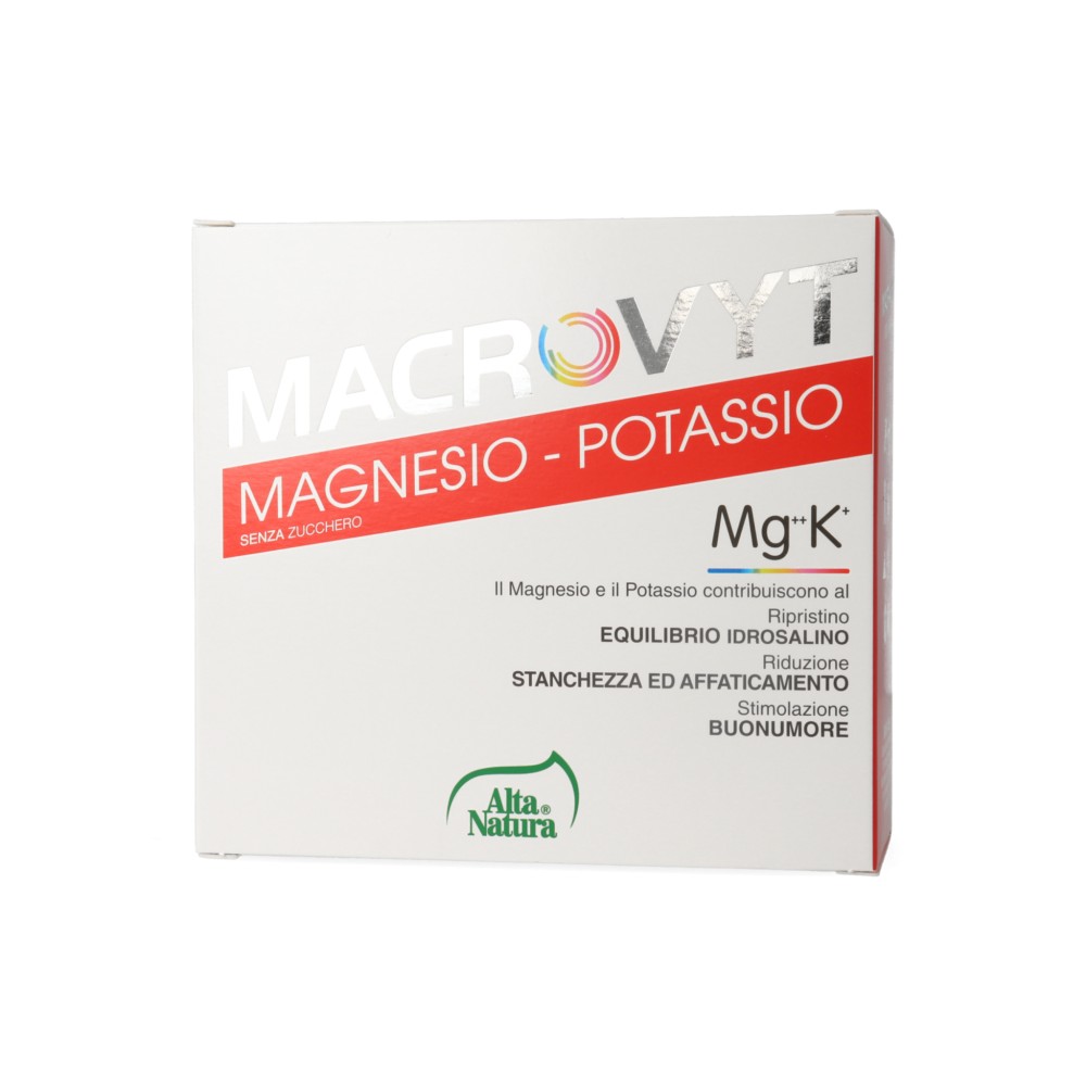 Macrovyt è un integratore alimentare di Magnesio e Potassio, con Vitamina C da fonte naturale, Vitamina E ed Acido Folico. Indicato in tutti i casi di ridotto apporto dei suddetti componenti con la dieta o di aumentato fabbisogno degli stessi.